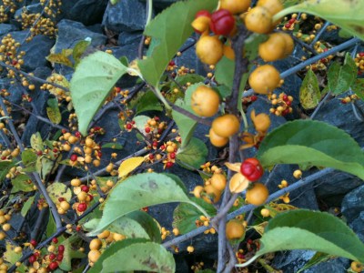 Oriental bittersweet, Celastrus orbiculatus, is native to eastern Asia and was planted in North America for ornamental uses as early as 1736. The vines are easily propagated, grow vigorously up to 60′ and 6″ in diameter in a wide range of environmental conditions and produce attractive fruit that has been used by the cut-flower and craft industries. American bittersweet, Celastrus scandens, is native to much of the temperate United States. American bittersweet vines are also vigorous but are much better behaved and produce larger and showier fruits. Both species have separate male and female plants and produce flowers, but only female plants produce fruit. The species are easily distinguished by fruit (female plants) and flower placement (male and female plants) at the leaf axils of Oriental bittersweet versus only at the terminal ends of American bittersweet. Fruit capsule color is another distinguishing trait. Oriental bittersweet has yellow fruit capsules and American has bright orange capsules.